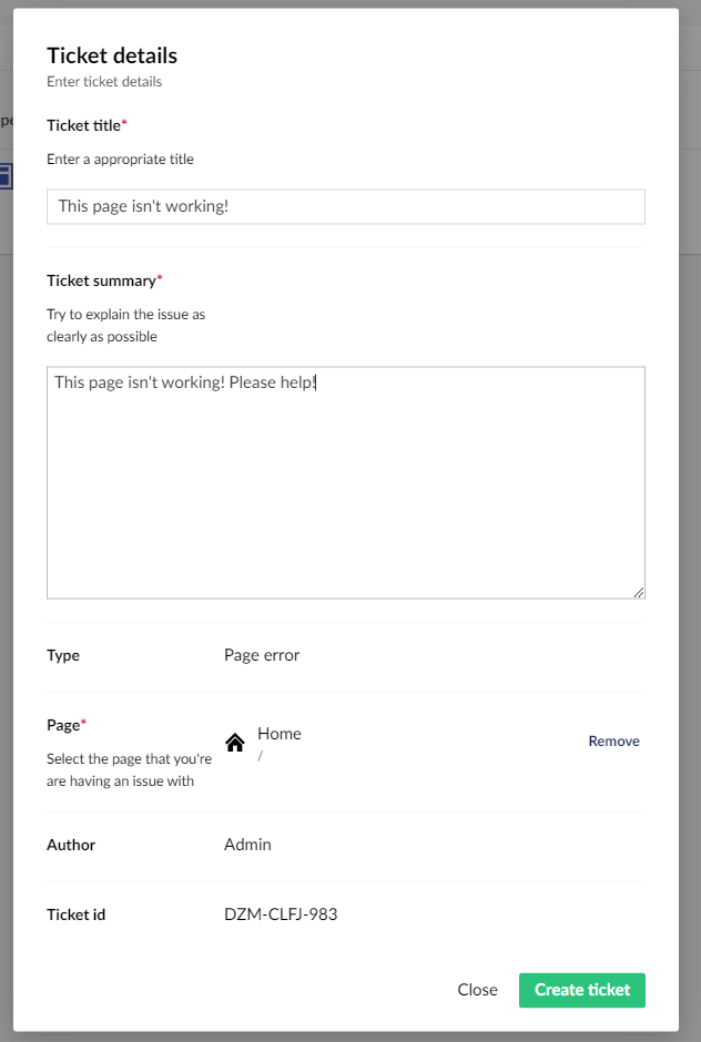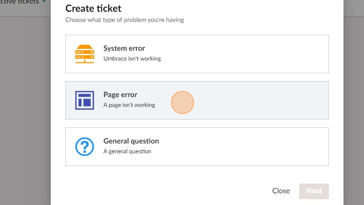 Step 3. If the selected ticket type includes an Umbraco property, such as the default Page error type, complete the extra field that appears. If not, continue to step 4.