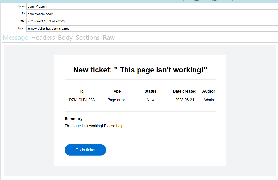 Step 6. If TicketUpdateEmail and your SMTP settings are configured, a notification email is sent to the address defined in that setting.
