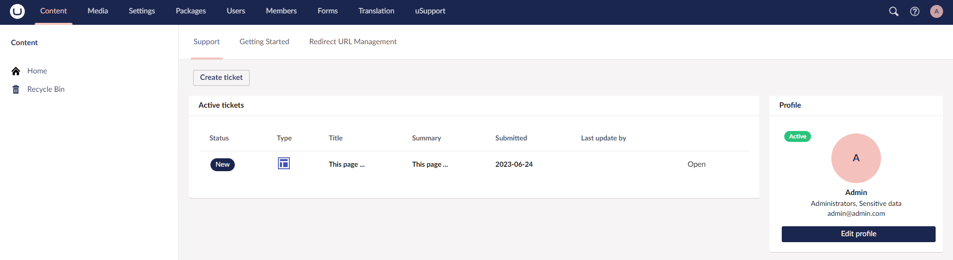 uSupport is a ticketing package for Umbraco that keeps support work inside the backoffice. Editors can create and follow tickets from the Content section, while support staff manage the full workflow from the dedicated uSupport section.